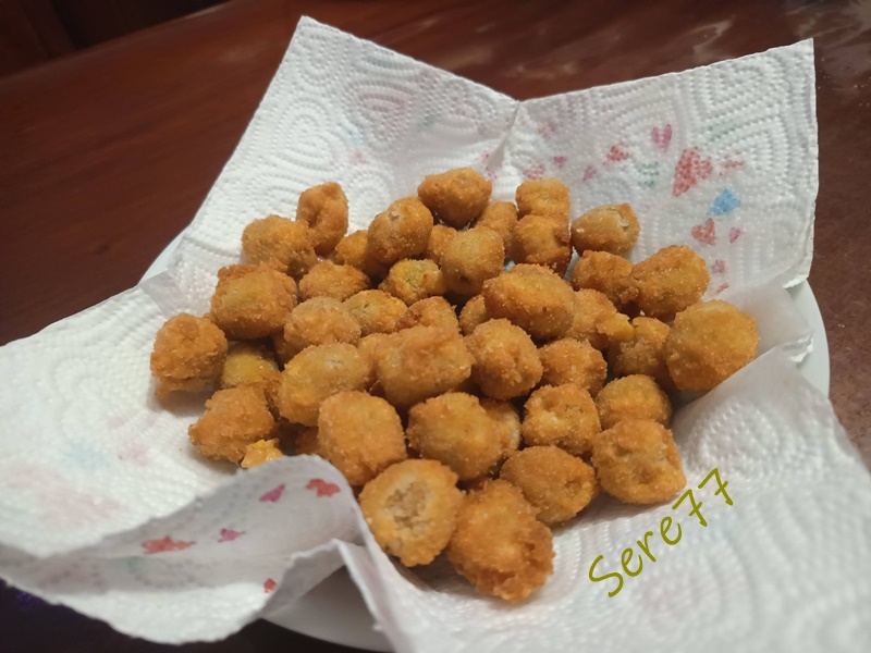 Scola grossolanamente le olive, mettile in un piatto e aggiungi farina, infarina per bene tutti i lati, in un altro piatto sbatti l'uovo, aggiungi le olive infarinate (setacciate), mescola e poi versa in un altro piatto con pane grattugiato, impanale per bene e cuoci in olio di arachidi per pochi minuti, giusto il tempo di farle ben dorare.